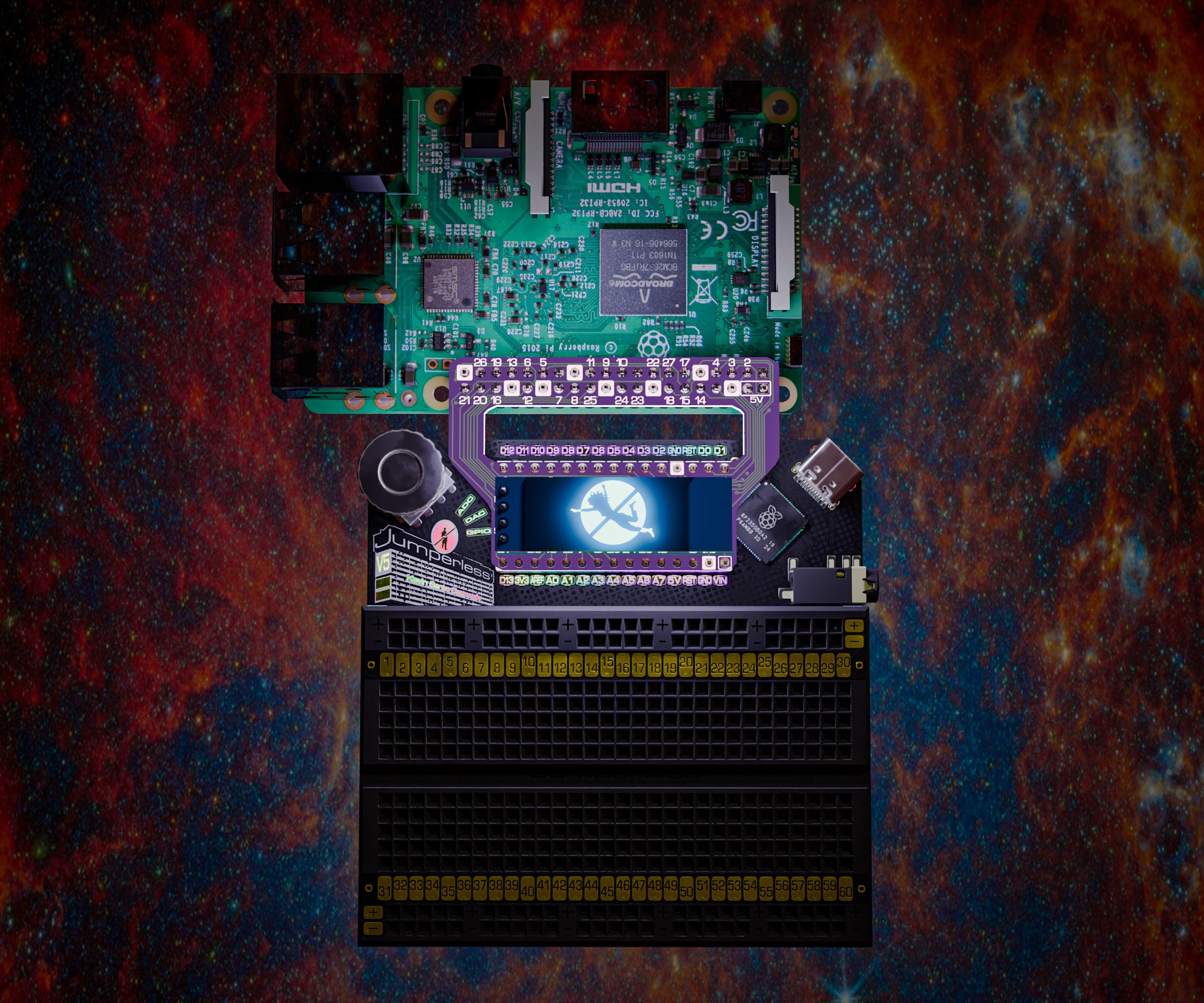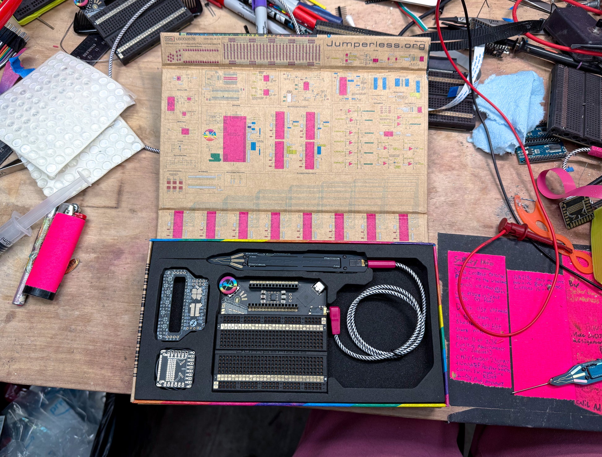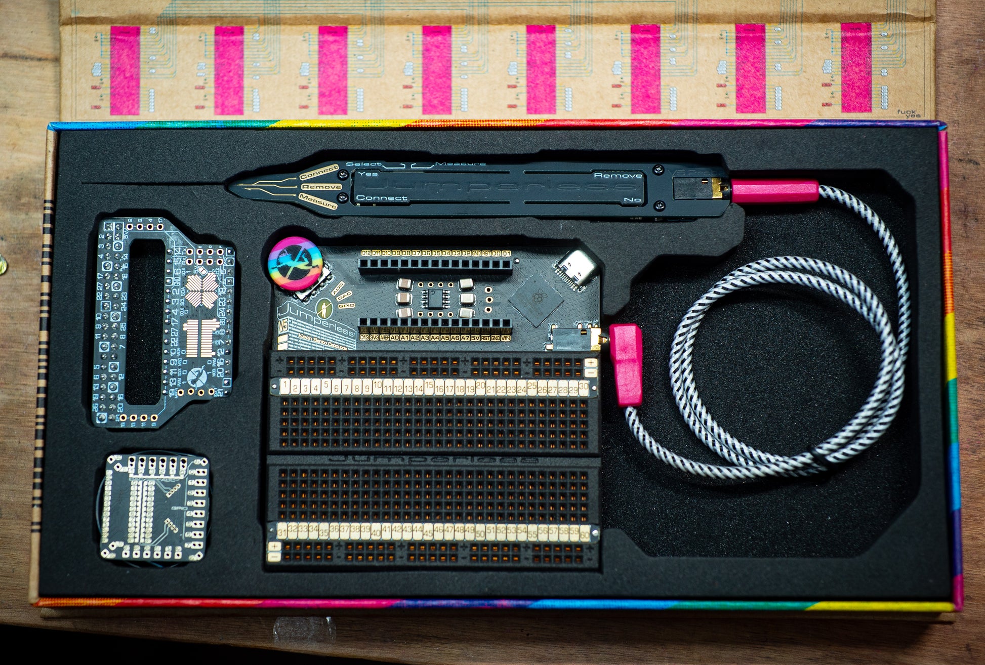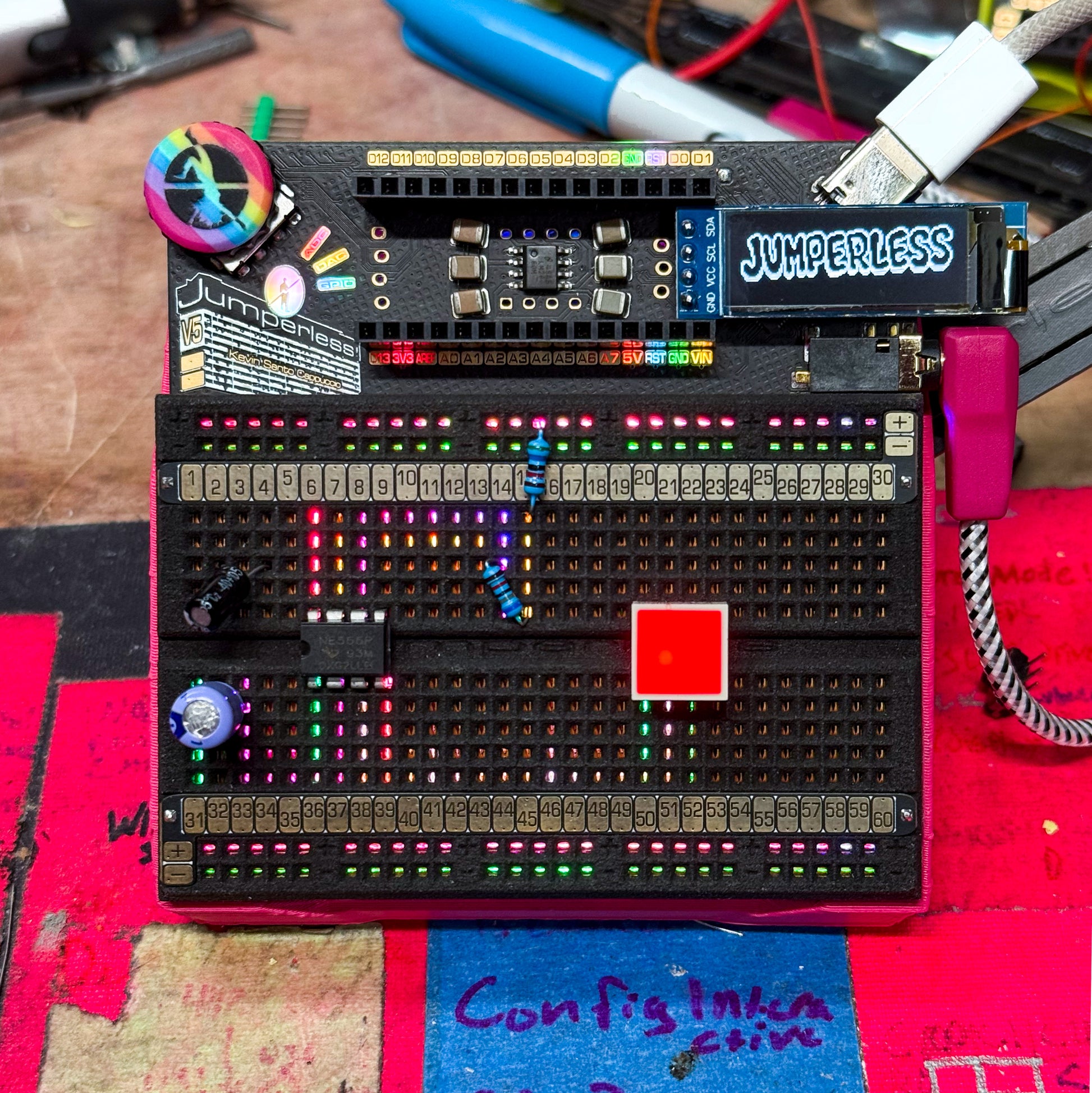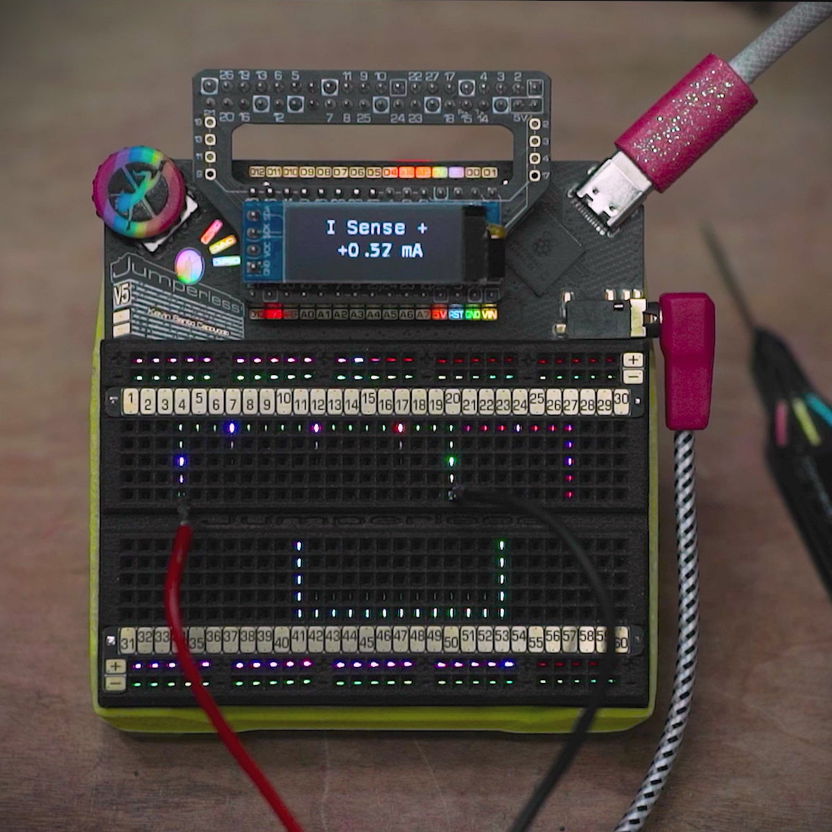 Jumperless V5 lets you prototype like a nerdy wizard who can see electricity and conjure jumpers with a magic wand. It’s an Integrated Development Environment (IDE) for hardware, with an analog-by-nature RP2350B-based dev board, a drawer full of wires, and a workbench full of test equipment (including a power supply, a multimeter, an oscilloscope, a function generator, and a logic analyzer) all crammed inside a breadboard.