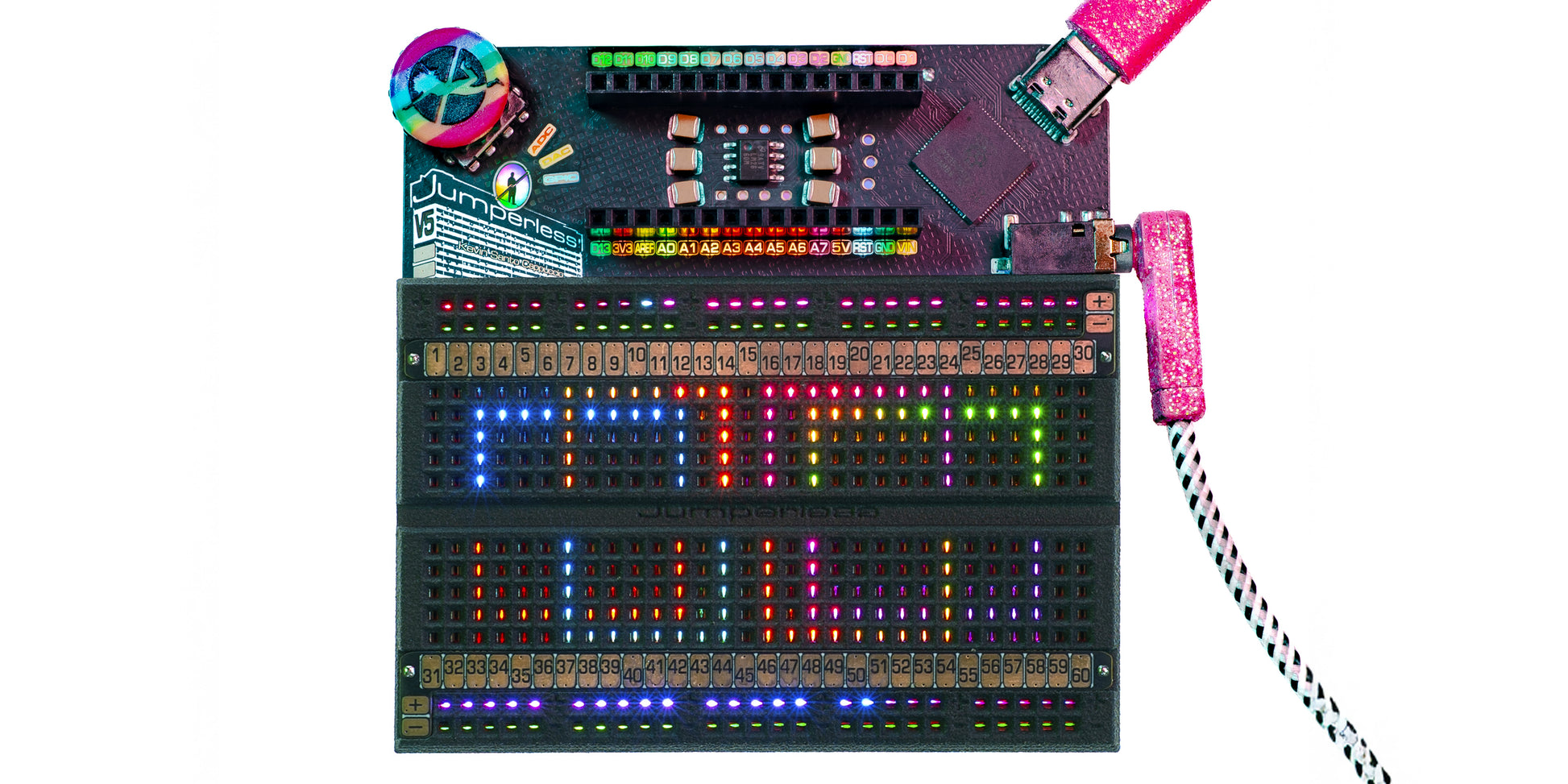 You can connect any point to any other using software-defined jumpers, so the four individually programmable ±8 V power supplies; ten GPIOs; and seven management channels for voltage, current, and resistance can all be connected anywhere on the breadboard or the Arduino Nano header. RGB LEDs under each hole turn the breadboard itself into a display that provides real-time information about whatever’s happening in your circuit.